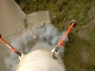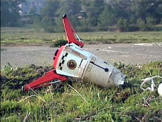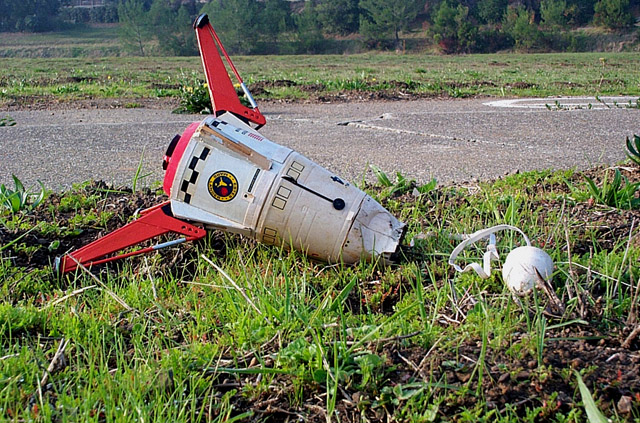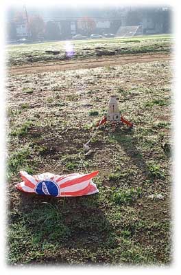 For some reason (defective C6-3?) the rocket became unstable just moments after launch. Needless to say it was disappointing but fortunately the damage wasn't severe. One leg broke free but it was easily fixed. The nose was crumpled a little but that too was easily fixed. It will fly again, but maybe never again on a C6-3, I'm looking at 18mm reloads and Apogee 18mm Ds (once they're back in production)