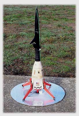 Recently, I was lucky enough to pick one up on Ebay, already built for $50!! Sure, it's risky to buy pre-built models, but I lucked out -- this one was well worth it and in great shape, all things considered. From the look of it, this model was built at least 20 years ago. It has this funky antique look to the paint and slight yellowing to the decals. It needed some minor repairs to make it flight worthy, but that was quickly dispatched. It didn't look like it had ever been flown, and still had the original rubber shock cord. (yes, I replaced that with a new one) |