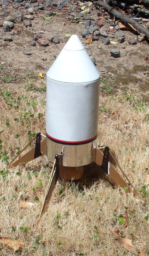 Still a lot of details to add, but it's ready for test flying. The legs on this "prototype" are fixed. Between the extra weight from the cluster, central E motor and construction of the custom body tube - fixing them got the rocket ready in time for the upcoming launch. (Mudroc)