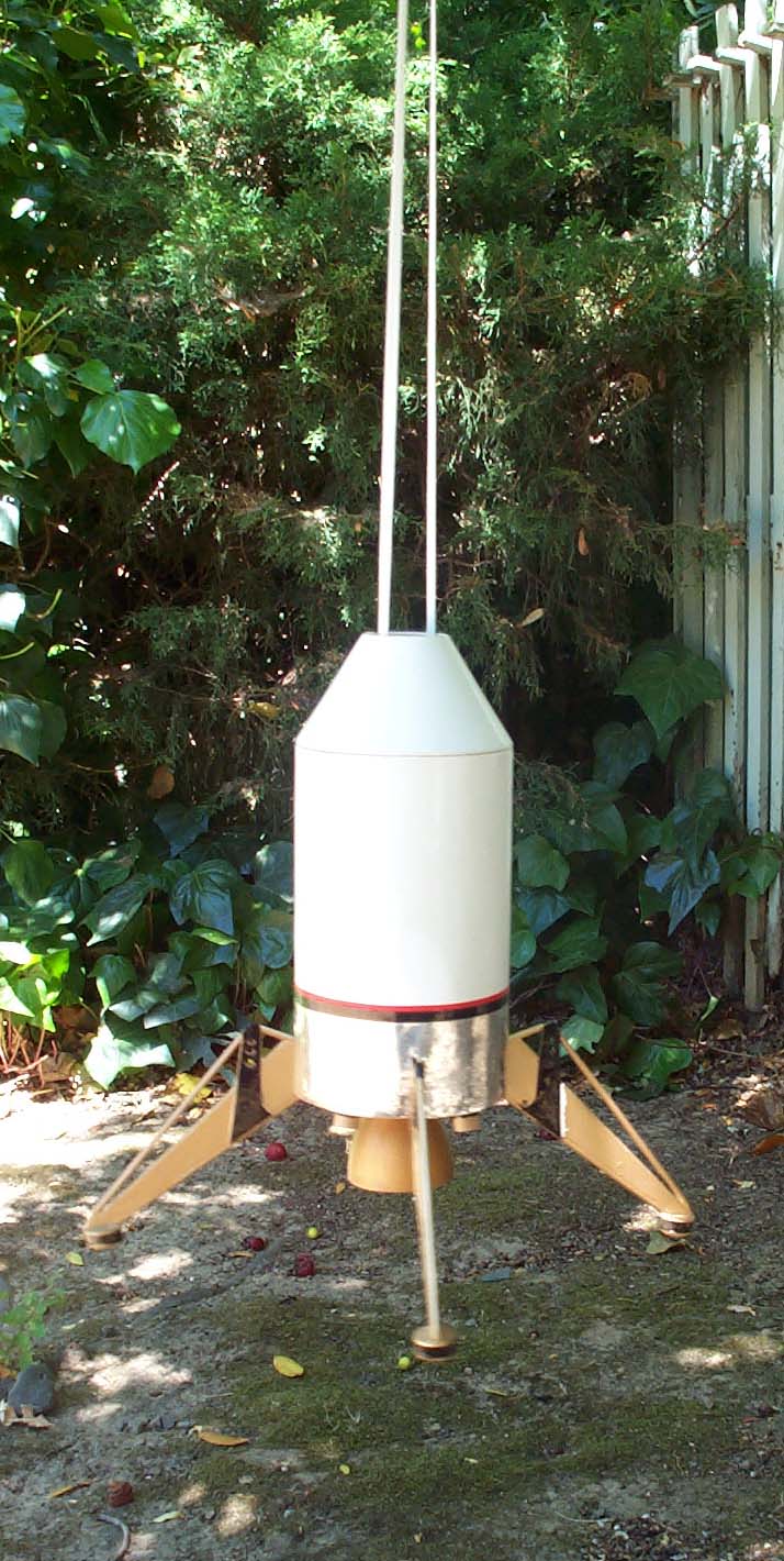 Here's the CSM Lander suspended by the recovery shock harness. The classic elastic Estes shock cord is attached on both sides of the inner body tube to hold the rocket level during decent.