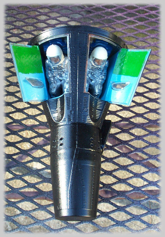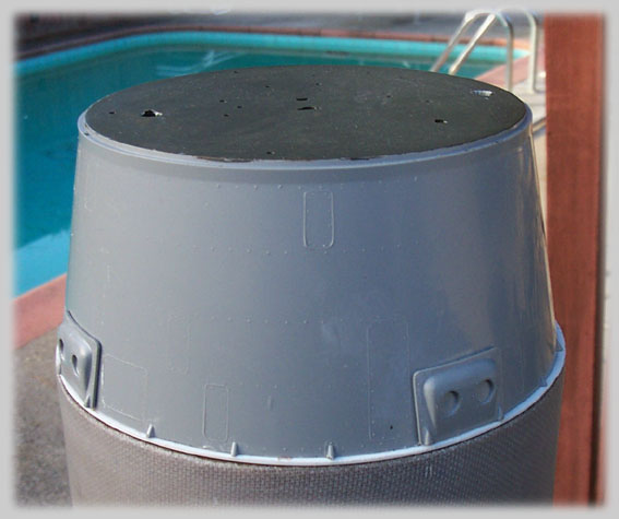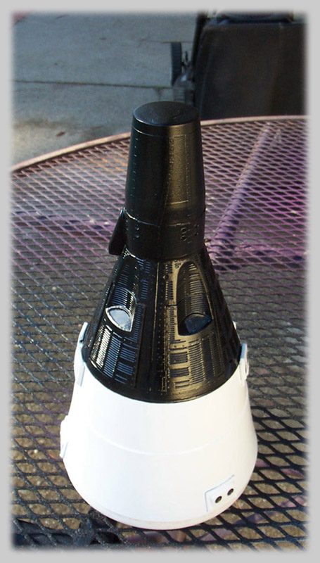 | I put three strips of fiberglass in to help insure that the capsule stays attached, they also cover the joint for the two service module pieces so this thing should hold together just great. I added some bolts to help with bulkhead attachment but I still needed to add a little more weight so I foam filled it and added 4 ounces of lead shot to the foam before it cured. I then both painted the foam and filled the bolt hole with epoxy and attached the bulkhead. The nosecone is now complete and weighing in at 1.25 pounds. | ||